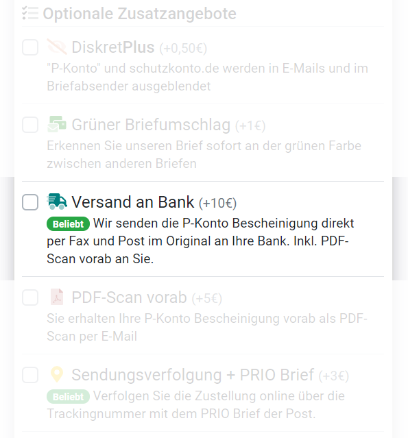 Hier können Sie schnellstmöglich an eine Bescheinigung gelangen und Ihr Existenzminimum über den Grundfreibetrag des P-Kontos hinaus sichern. Wir stellen Ihnen diese anerkannte Bescheinigung aus und senden sie postalisch an Sie oder Ihre Bank direkt zu. Die Bescheinigung muss bei der Bank abgegeben werden, bei der man sein P-Konto führt. Optional können Sie die Direktzustellung an die Bank auswählen um wertvolle Zeit zu sparen.